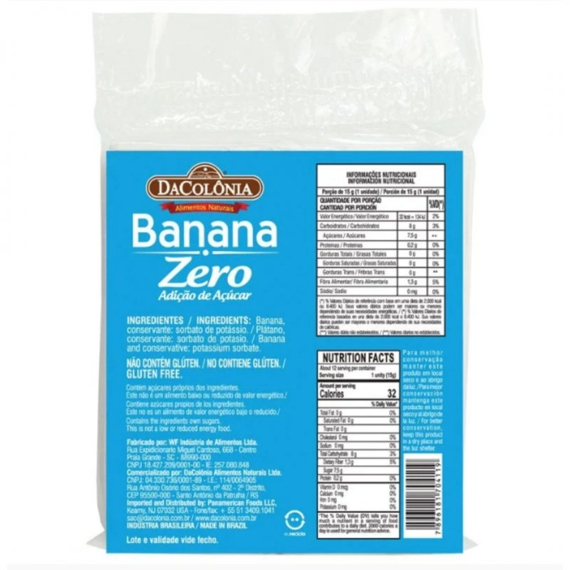 A Banana Zero DaColônia é zero açúcares, sem aditivos, sem adoçantes, sem lácteos e sem glúten! Um produto vegano. Uma ótima opção de docinho ou sobremesa!