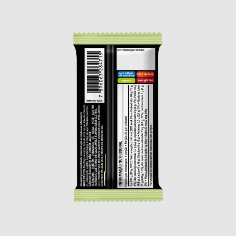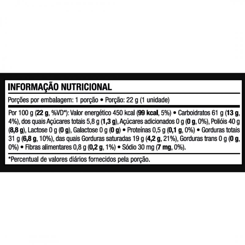 INGREDIENTES: Manteiga de cacau, leite de arroz em pó, leite de coco em pó, edulcorante maltitol, emulsificantes lecitina de soja e INS 476 e aromas. NÃO CONTÉM GLÚTEN.