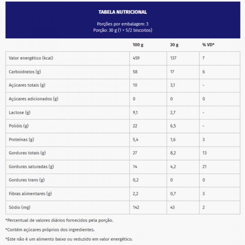 Ingredientes: farinha de trigo enriquecida com ferro e ácido fólico, gordura vegetal, soro de leite em pó parcilamente desmineralizado, permeado de soro de leite em pó, cacau em pó, alfarroba em pó, edulcorantes: maltitol e glicosídeos de steviol de stevia rebaudiana bertoni, aromatizante, emulsificante lecitina e fermento químico bicarbonato de sódio. Alérgicos: contém derivados de trigo, soja e leite. Pode conter centeio, cevada, aveia e gergelim. Contém glúten. Contém lactose.
