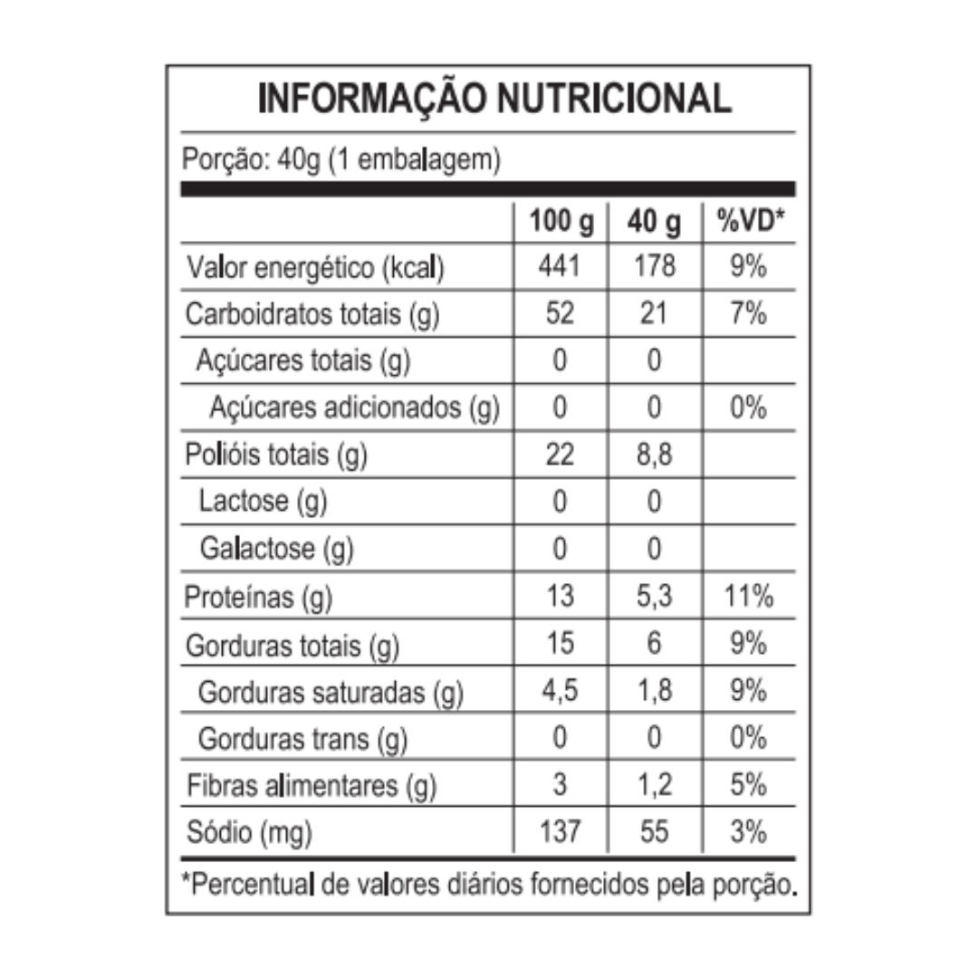 INGREDIENTES: Fécula de mandioca, mix de proteínas (proteína concentrada do soro do leite sem lactose e proteína de ervilha e/ou proteína de arroz), gordura de palma, óleo de girassol, cacau em pó, sal marinho, edulcorantes maltitol e glicosídeos de esteviol, aromatizantes, emulsificantes lecitina de girassol e goma xantana e agente de crescimento bicarbonato de sódio.