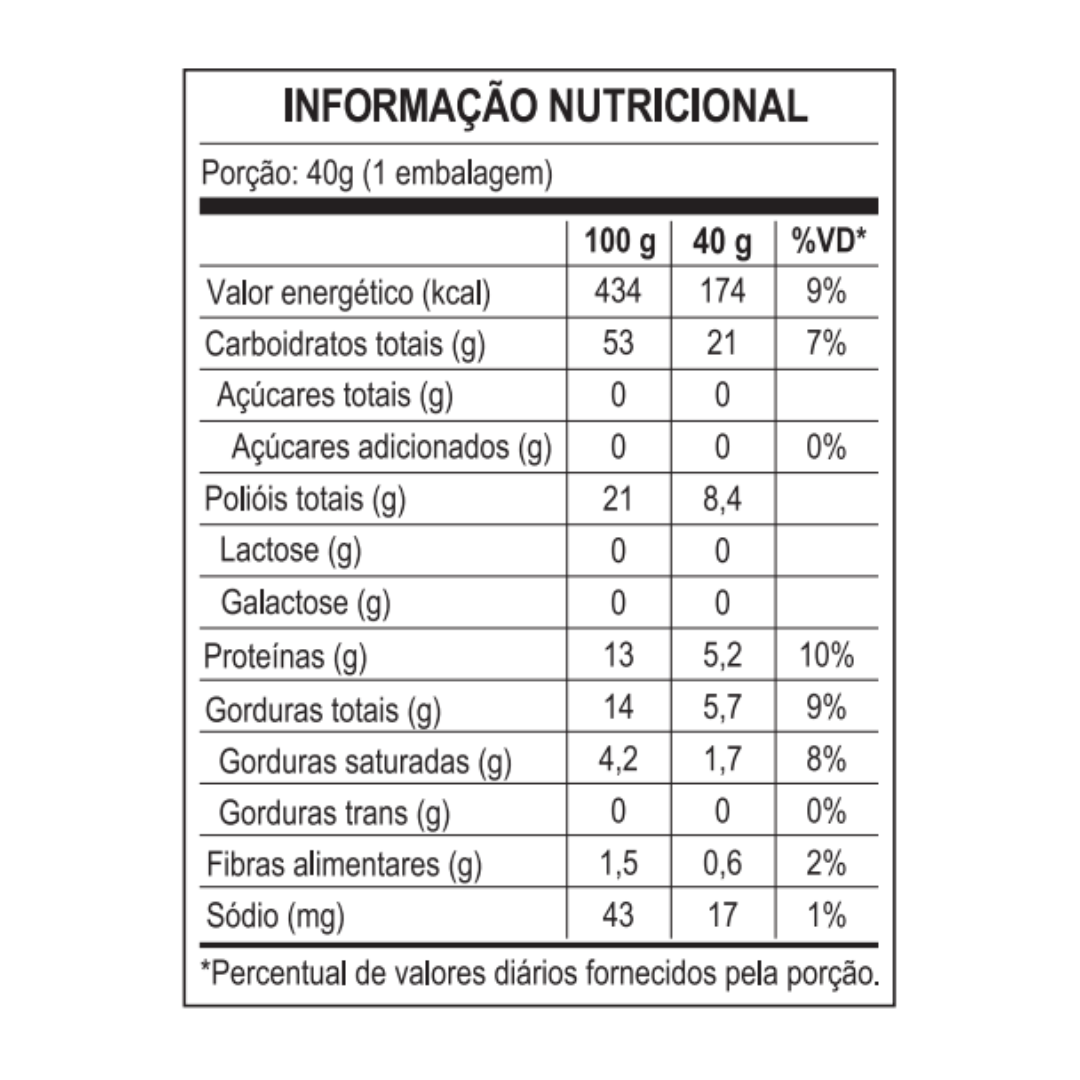 INGREDIENTES: Fécula de mandioca, mix de proteínas (proteína concentrada do soro do leite sem lactose e proteína de ervilha e/ou proteína de arroz), gordura de palma, óleo de girassol, cacau em pó, sal marinho, edulcorantes maltitol e glicosídeos de esteviol, aromatizantes, emulsificantes lecitina de girassol e goma xantana e agente de crescimento bicarbonato de sódio.
